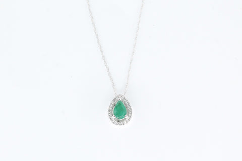 White Gold Emerald and Diamond Halo Pendant with Chain