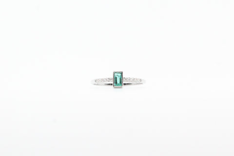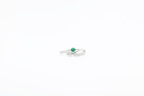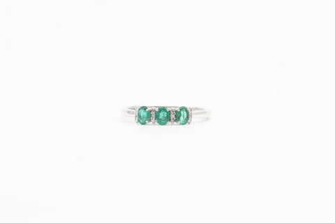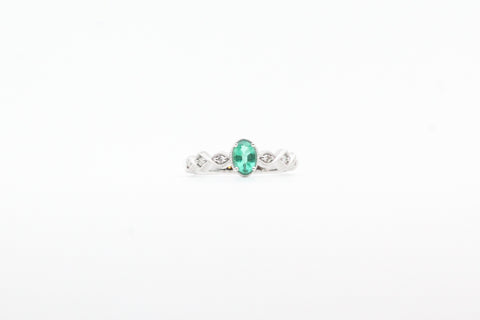 • White Gold Oval Emerald and Diamond Ring with Milgrain Band